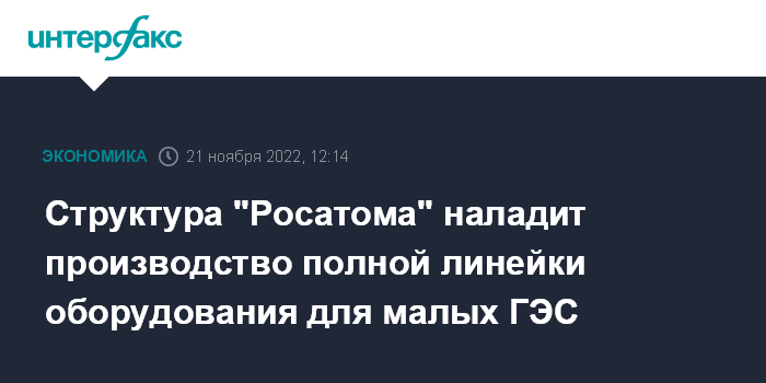 Москва. 21 ноября. INTERFAX.RU - "Русатом сервис" (входит в ГК "Росатом") планирует производить полную линейку оборудования для малой гидроэнергетики, заявил гендиректор компании Евгений Сальков на форуме "Атомэкспо-2022" в Сочи.