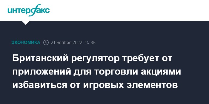 Москва. 21 ноября. INTERFAX.RU - Британский финансовый регулятор требует от операторов приложений для торговли акциями пересмотреть интерфейс сервисов, поскольку присутствующие в них игровые элементы могут склонять пользователей к чрезмерному риску.
