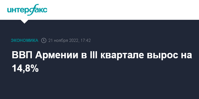 Москва. 21 ноября. INTERFAX.RU - В III квартале 2022 года ВВП Армении увеличился на 14,8% в годовом измерении, сообщила пресс-служба правительства республики.