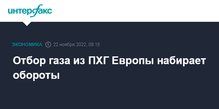 Москва. 22 ноября. INTERFAX.RU - Отбор газа из подземных хранилищ Европы день ото дня набирает обороты. В воскресенье, 20 ноября, хранилища потеряли 108 млн куб. м - 0,1% их объема.