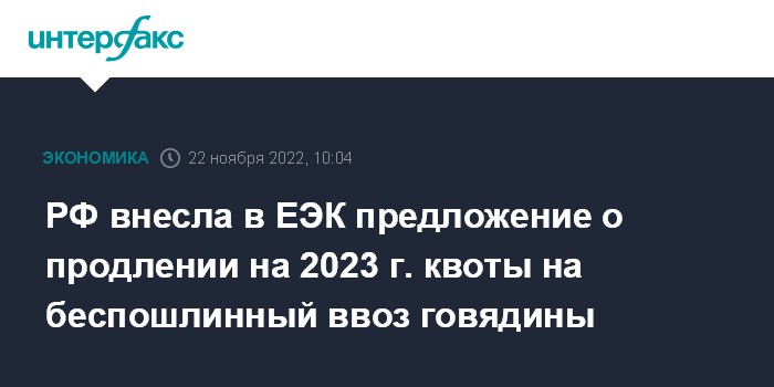 Москва. 22 ноября. INTERFAX.RU - РФ внесла в Евразийскую экономическую комиссию (ЕЭК) инициативное предложение о продлении на 2023 год квоты на беспошлинный ввоз говядины, предназначенной для производства мясной продукции, сообщается на правовом портале ЕЭК.