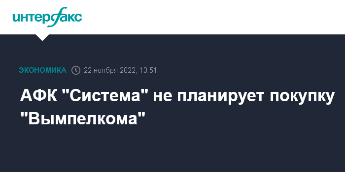 Москва. 22 ноября. INTERFAX.RU - ПАО АФК "Система" не планирует покупку телеком-оператора "Вымпелком", сообщил журналистам основатель и крупнейший акционер корпорации Владимир Евтушенков.