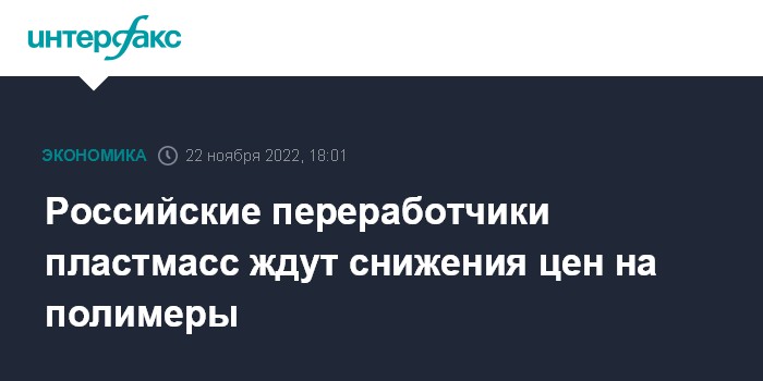 Москва. 22 ноября. INTERFAX.RU - Российские переработчики пластмасс при нынешних ценах закупают сырье только по потребностям текущего производства, не создавая складские запасы, и ждут снижения цен на базовые полимеры, считает генеральный директор Союза переработчиков пластмасс Петр Базунов. Его мнение приводит агентство Plastinfo.