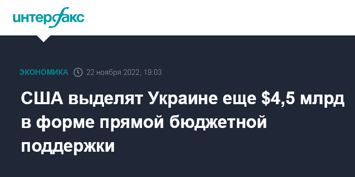Москва. 22 ноября. INTERFAX.RU - США направят Украине еще $4,5 млрд субсидий для прямой поддержки бюджета страны, средства начнут распределять в ближайшие недели, заявила американский министр финансов Джанет Йеллен. Ее заявление опубликовано на сайте Минфина.
