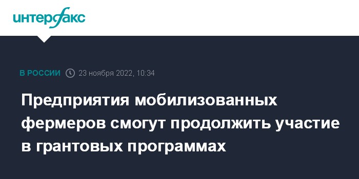 Москва. 23 ноября. INTERFAX.RU - Фермерские хозяйства, чьи руководители призваны по частичной мобилизации, смогут продолжить участие в грантовых программах, сообщила пресc-служба правительства.
