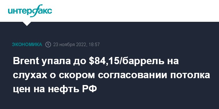Москва. 23 ноября. INTERFAX.RU - Падение цен на нефть ускорилось вечером в среду на слухах о скором согласовании потолка цен на поставки нефти из России.