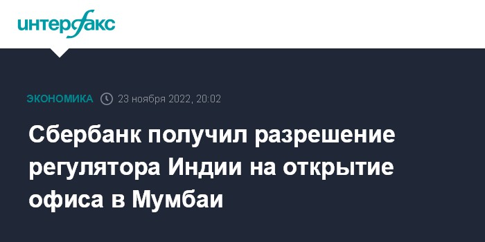 Москва. 23 ноября. INTERFAX.RU - Сбербанк России получил разрешение регулятора Индии на открытие филиала в Мумбаи, откроет его в 2023 году, сообщил журналистам первый зампред правления банка Александр Ведяхин.