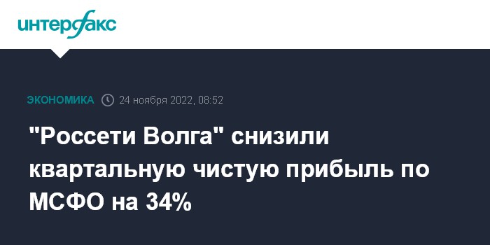 Москва. 24 ноября. INTERFAX.RU - В III квартале 2022 года ПАО "Россети Волга" получило чистую прибыль по МСФО в размере 157,853 млн рублей, что на 33,7% меньше, чем годом ранее, говорится в отчетности компании.