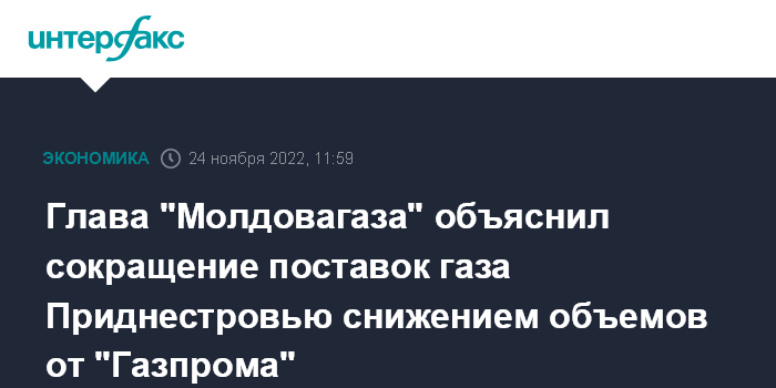 Москва. 24 ноября. INTERFAX.RU - Председатель правления АО "Молдовагаз" Вадим Чебан считает обоснованным уменьшение поставок газа в Приднестровский регион с учетом сокращения почти вдвое объемов отпуска "Газпромом" газа Молдавии.