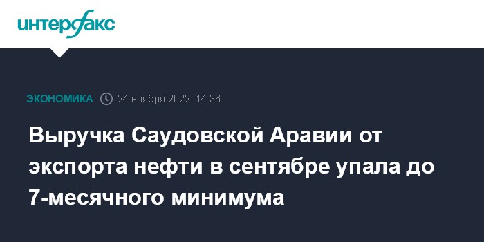 Москва. 24 ноября. INTERFAX.RU - Выручка Саудовской Аравии от экспорта нефти в сентябре достигла самой низкой отметки с марта.