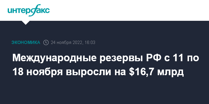 Международные резервы РФ с 11 по 18 ноября выросли на $16,7 млрд