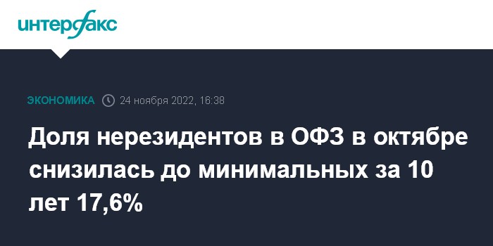 Москва. 24 ноября. INTERFAX.RU - В октябре 2022 года доля нерезидентов в ОФЗ снизилась до 17,6% с 17,9%, сообщает сайт Банка России.