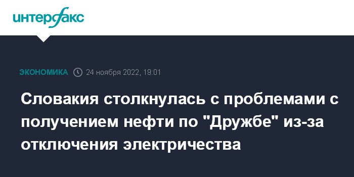 Москва. 24 ноября. INTERFAX.RU - Поставки нефти по трубопроводу "Дружба" из Украины в Словакию приостановлены из-за отключения электроэнергии, сообщает чешское информационное агентство CTK со ссылкой на чешского трубопроводного оператора MERO.