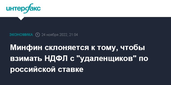Москва. 24 ноября. INTERFAX.RU - Минфин РФ склоняется к тому, чтобы сохранить для дистанционных работников российских компаний, которые выполняют трудовые обязанности из-за рубежа, ставку НДФЛ на уровне 13-15%, и обсуждает этот вопрос с депутатами, сообщил глава ведомства Антон Силуанов.