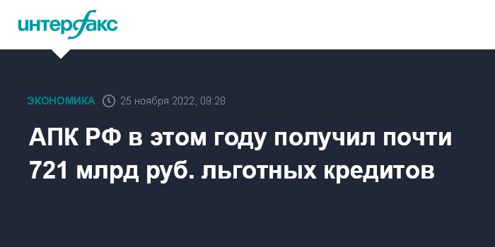 Москва. 25 ноября. INTERFAX.RU - АПК РФ в этом году получил почти 721 млрд рублей льготных кредитов, сообщает пресс-служба Минэкономразвития со ссылкой на главу ведомства Максима Решетникова, совершившего визит в Якутию.