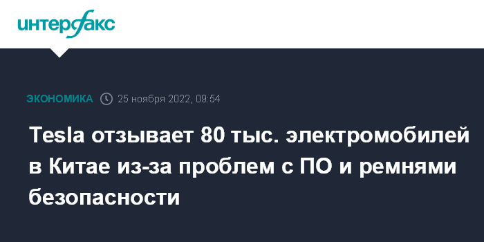 Москва. 25 ноября. INTERFAX.RU - Tesla Inc отзывает 80 тыс. электромобилей в Китае из-за проблем с программным обеспечением и ремнями безопасности, сообщает Market Watch со ссылкой на Государственное управление рыночного регулирования (State Administration for Market Regulation, SAMR).