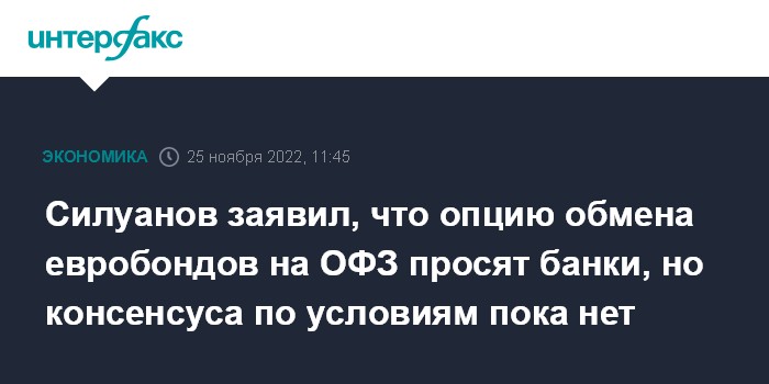 Москва. 25 ноября. INTERFAX.RU - Опция обмена в 2023 году суверенных еврооблигаций РФ на новые ОФЗ, которая была включена в проект федерального бюджета в процессе его доработки ко второму чтению, появилась в результате диалога с банками, но консенсуса по условиям потенциальной сделки с ними пока нет, заявил глава Минфина Антон Силуанов.