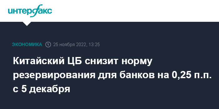 Москва. 25 ноября. INTERFAX.RU - Народный банк Китая (НБК, центробанк страны) снизит норму резервирования для банков на 0,25 п.п. с 5 декабря, что, как ожидается, высвободит ликвидность на общую сумму 500 млрд юаней ($70 млрд) в финансовой системе.