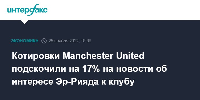 Москва. 25 ноября. INTERFAX.RU - Котировки Manchester United plc подскочили на 17% на торгах в Нью-Йорке в пятницу после слов министра спорта Саудовской Аравии принца Абдулазиза бин Турки Аль Сауда о готовности поддержать покупку английского футбольного клуба частными саудовскими инвесторами.