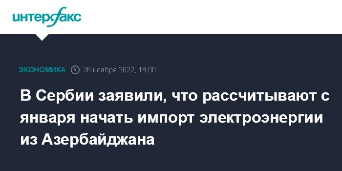 Москва. 26 ноября. INTERFAX.RU - Сербия планирует с начала 2023 года получать электроэнергию из Азербайджана, сообщила в субботу министр горнодобывающей промышленности и энергетики Сербии Дубравка Джедович.