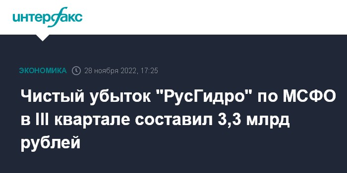 Москва. 28 ноября. INTERFAX.RU - Чистый убыток ПАО "РусГидро" по МСФО в III квартале 2022 года составил 3,32 млрд рублей против 12,15 млрд рублей прибыли годом ранее, следует из отчета компании.