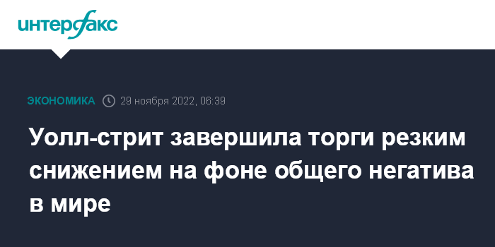 Москва. 29 ноября. INTERFAX.RU - Американские фондовые индексы завершили первые торги этой недели резким падением из-за снижения аппетита инвесторов к риску на фоне роста напряженности в Китае в связи с новыми антиковидными ограничениями.