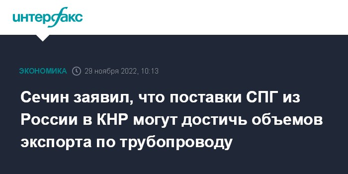 Сечин заявил, что поставки СПГ из России в КНР могут достичь объемов экспорта по трубопроводу
