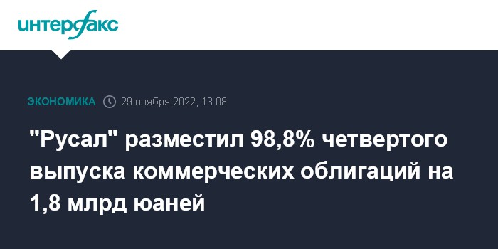 "Русал" разместил 98,8% четвертого выпуска коммерческих облигаций на 1,8 млрд юаней