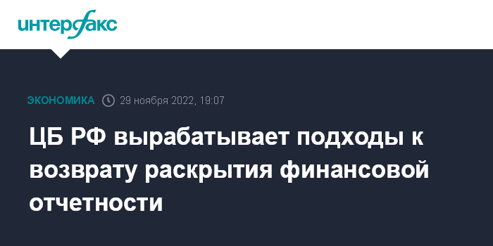 Москва. 29 ноября. INTERFAX.RU - Банк России вырабатывает подходы к возврату публикации финансовой отчетности как финансовых, так и нефинансовых организаций, говорится в проекте Основных направлений развития финансового рынка РФ на 2023 год и период 2024-2025 годов