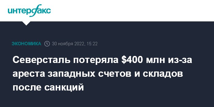 Москва. 30 ноября. INTERFAX.RU - "Северсталь" потеряла $400 млн из-за ареста западных счетов и складов, заявил председатель совета директоров компании Алексей Мордашов на пленарном заседании в рамках форума "Российский промышленник".