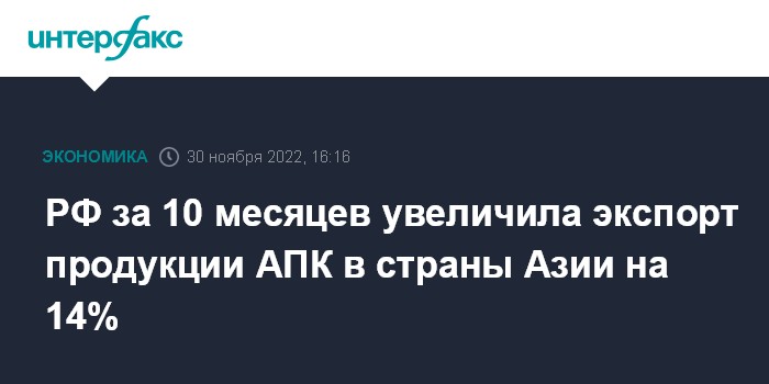 Москва. 30 ноября. INTERFAX.RU - Россия за 10 месяцев 2022 года, по предварительным данным, увеличила экспорт продукции АПК в страны Азии (в расчет включены государства Восточной, Юго-Восточной и Южной Азии) на 14% в стоимостном выражении, сообщает центр "Агроэкспорт" при Минсельхозе.