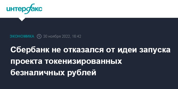 Москва. 30 ноября. INTERFAX.RU - Сбербанк по-прежнему хочет предложить рынку токенизированные безналичные рубли.