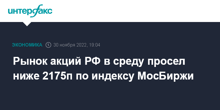 Москва. 30 ноября. INTERFAX.RU - Рынок акций РФ в среду умеренно просел по индексам при смешанной динамике цен blue chips на фоне неоднозначных сигналов с внешних фондовых площадок и выросшей нефти. Индекс МосБиржи опустился ниже 2175 пунктов на фоне укрепления рубля.
