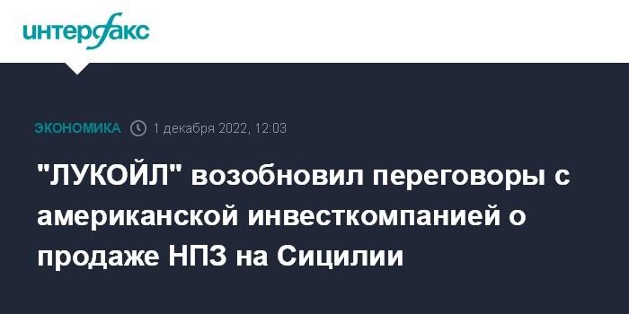 "ЛУКОЙЛ" возобновил переговоры с американской инвесткомпанией о продаже НПЗ на Сицилии