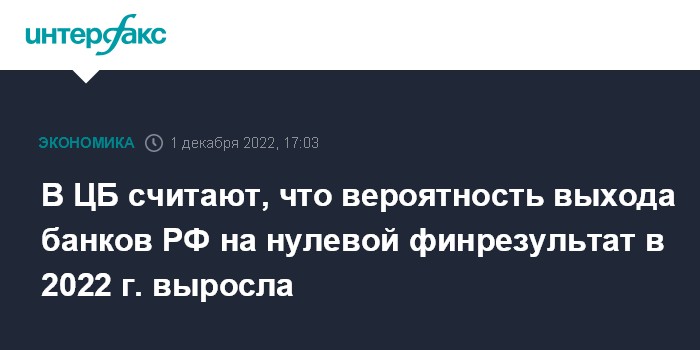 Москва. 1 декабря. INTERFAX.RU - Вероятность выхода банковского сектора РФ на нулевой финансовый результат в 2022 году увеличилась, заявил на пресс-конференции директор департамента банковского регулирования и аналитики ЦБ Александр Данилов.