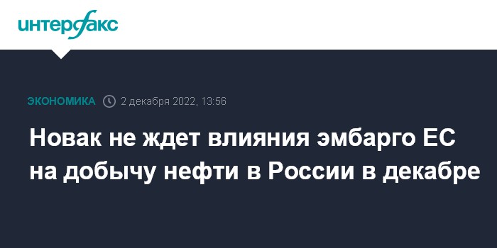 Москва. 2 декабря. INTERFAX.RU - Эмбарго Евросоюза на покупку российской нефти, которое начинает действовать с 5 декабря, не повлияет на уровень добычи нефти в России в декабре, поскольку контракты заключены ранее, заявил вице-премьер РФ Александр Новак.