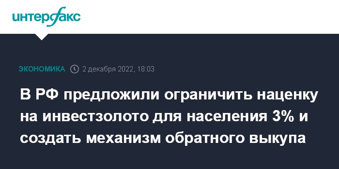В РФ предложили ограничить наценку на инвестзолото для населения 3% и создать механизм обратного выкупа