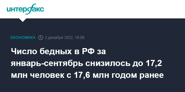 В I квартале 2022 года численность бедных оценивалась в 20,9 млн человек (уровень бедности - 14,3%), во II квартале 2022 года - в 17,6 млн человек (12,1%).