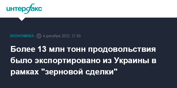 "По состоянию на 4 декабря общий тоннаж зерна и другой агропродукции, экспортированной из трех украинских портов, составляет 13 023 448 тонн. Всего на данный момент было разрешено движение 1046 судов: 522 на прибытие в украинские порты и 524 - на выход из них", - подчеркивается в сообщении.