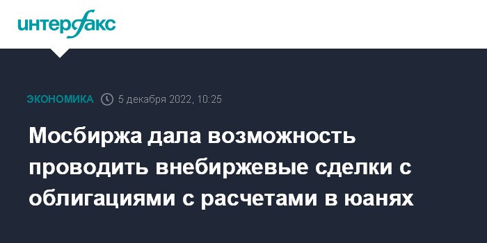Москва. 5 декабря. INTERFAX.RU - "Московская биржа" с 5 декабря предоставляет возможность банкам, брокерам, управляющим компаниям и их клиентам заключать внебиржевые сделки с облигациями с расчетами в китайских юанях, говорится в сообщении биржи.