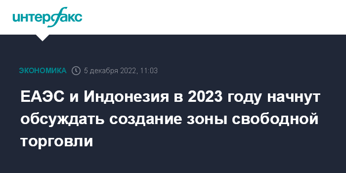 Москва. 5 декабря. INTERFAX.RU - Евразийский экономический союз (ЕАЭС) и Индонезия дали официальный старт переговорам о создании зоны свободной торговли, первый переговорный раунд запланирован на I квартал 2023 года.