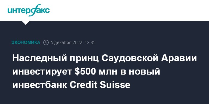 Наследный принц рассматривает возможность инвестировать около $500 млн в новый бизнес Credit Suisse, CS First Boston. Дополнительное финансирование могут предоставить американские инвесторы, включая инвесткомпанию Atlas Merchant Capital Боба Даймонда, ранее возглавлявшего Barclays.