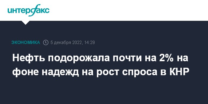 Москва. 5 декабря. INTERFAX.RU - Цены на нефть ускорили рост в ходе торгов в понедельник, повышаясь примерно на 2%, на фоне перспектив восстановления спроса в Китае.