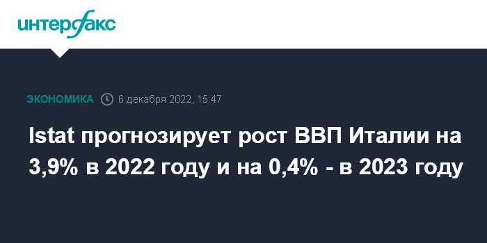 Москва. 6 декабря. INTERFAX.RU - Рост экономики Италии резко замедлится в 2023 году из-за высокой инфляции, ослабления активности мировой торговли и ужесточения денежно-кредитной политики, прогнозирует итальянское статистическое агентство Istat.