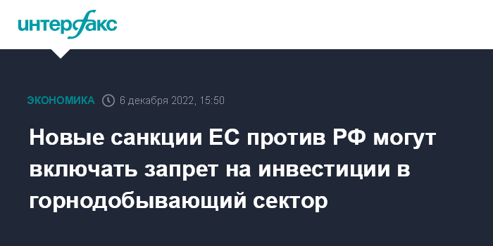 Москва. 6 декабря. INTERFAX.RU - В очередной, девятый, пакет санкций ЕС против РФ могут войти запрет на новые инвестиции в российский горнодобывающий сектор, запрет на операции еще с тремя российскими банками, сообщает во вторник Financial Times (FT) со ссылкой на источники.