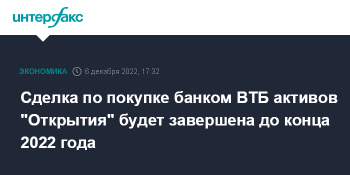 Москва. 6 декабря. INTERFAX.RU - Сделка по покупке банком ВТБ активов группы "Открытие" будет завершена до конца 2022 года, сообщил журналистам замминистра финансов Алексей Моисеев.