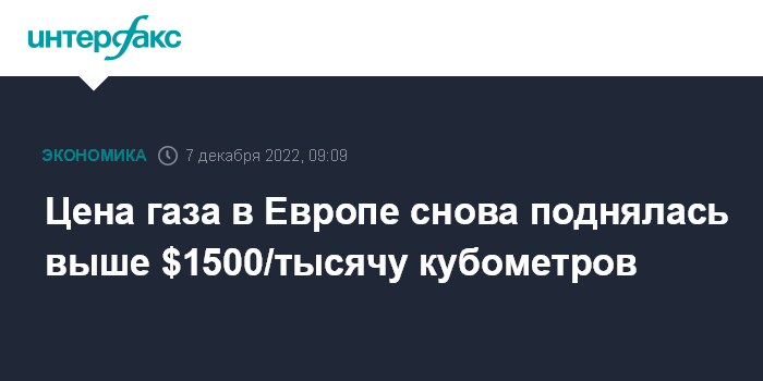 Москва. 7 декабря. INTERFAX.RU - Слабый ветер и прогнозы все более суровой зимы вернули цену на газ в Европе на уровень выше $1500 за тысячу кубометров после недельной коррекции.