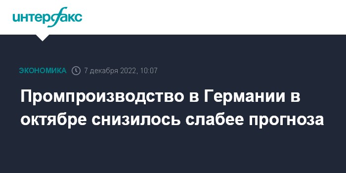 Москва. 7 декабря. INTERFAX.RU - Объем промышленного производства в ФРГ в октябре сократился на 0,1% по сравнению с предыдущим месяцем, свидетельствуют данные Федерального статистического управления страны (Destatis).