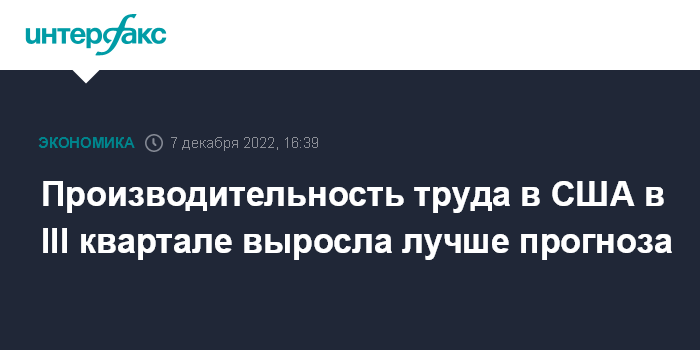 Москва. 7 декабря. INTERFAX.RU - В III квартале 2022 года производительность труда в США увеличилась на 0,8%, показали окончательные данные Минтруда страны. Стоимость рабочей силы в Соединенных Штатах в июле-сентябре повысилась на 2,4%.