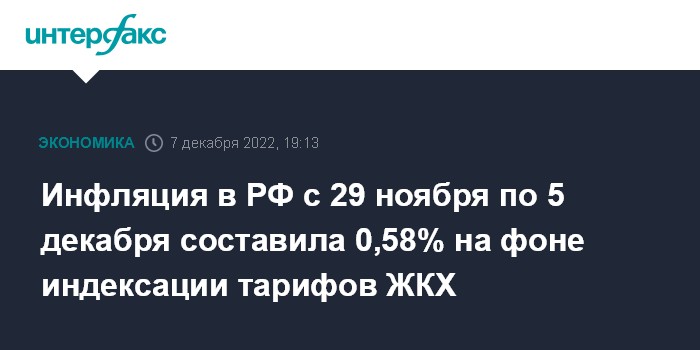 Инфляция в РФ с 29 ноября по 5 декабря составила 0,58% на фоне индексации тарифов ЖКХ